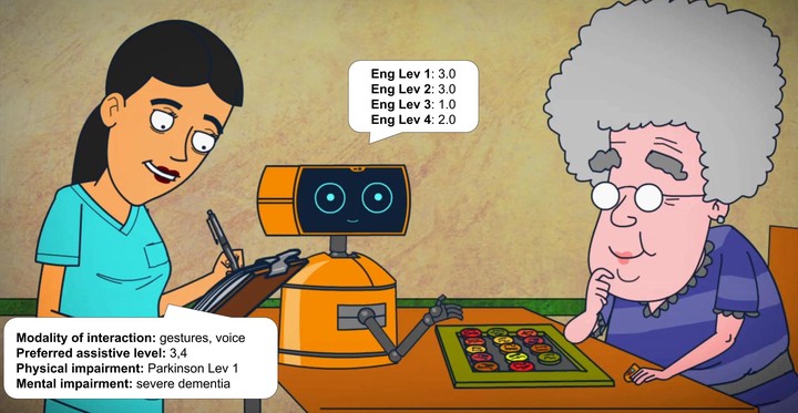 In this paper, we present a decision system to embed in robot that can set up a productive interaction with a patient, and can be employed by the caregiver to motivate and support him while performing cognitive exercises as SKT. We propose two different interaction loops. First, the robot interacts with the caregiver in order to set up the mental and physical impairments of the patient and indicate a goal for the exercise. This is used to determine the desired robot behavior (human-centric or robot-centric, and preferred interaction modalities). Second, the robot interacts with the patient and adapts its actions to engage and assist him to complete the exercise. Two batches of experiments were conducted, and the results indicated that the robot can take profit of the initial interaction with the caregiver to provide a quicker personalization, and also it can adapt to different user responses and provide support and assistance at different levels of interaction.