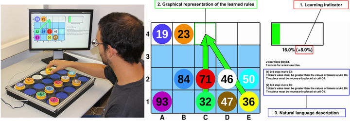 In this paper, we present a learning approach to facilitate the teaching of new board exercises to assistive robotic systems. We formulate the problem as the learning of action models using Boolean predicates, disjunctive preconditions, and existential quantifiers from demonstrations of successful exercise executions. To be able to cope with exercises whose rules depend on a set of features that are initialized at the beginning of each play-out, we introduce the concept of dynamic context. Furthermore, we show how the learnt knowledge can be represented intuitively in a graphical interface that helps the caregiver understand what the system has learnt. As validation, we conducted a user study in which we evaluated whether and to which extent different types of feedback can affect the subjects’ performance while teaching three types of exercises: (1) sorting numbers; (2) arranging letters; and (3) reproducing shapes sequences in reversed order. The results suggest that textual and graphical feedback are beneficial.